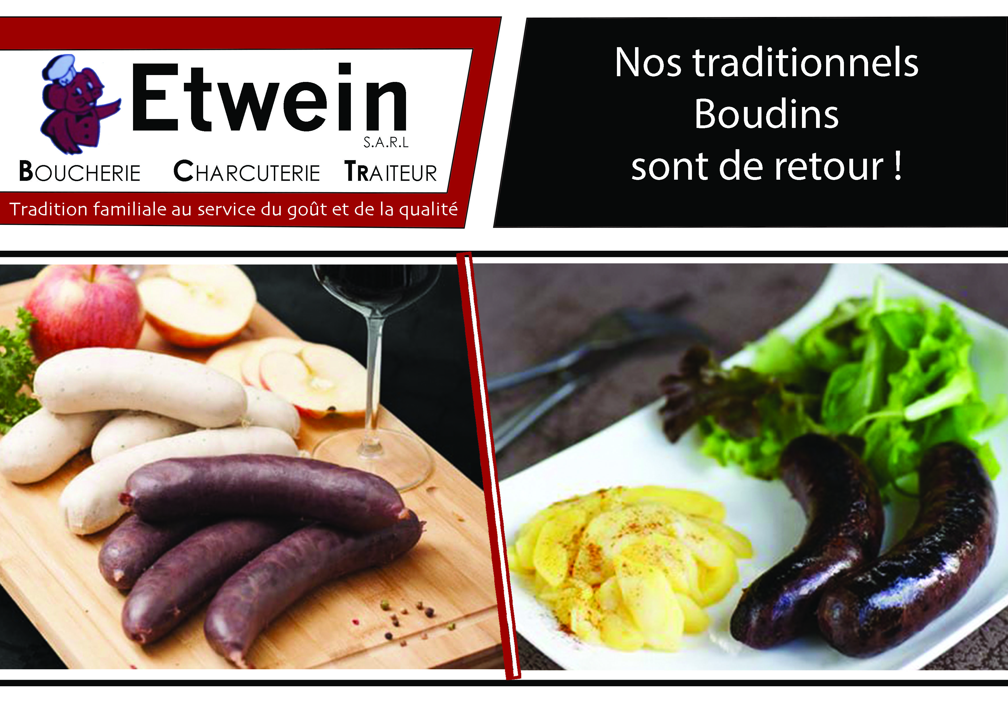 Marie-Laure et Philippe Etwein sont heureux de vous présenter Le site de la Boucherie Charcuterie Traiteur Etwein Nous mettons un point d'honneur à proposer des produits artisanaux et de qualité supérieure, préparés avec soin et fraîcheur pour vous satisfaire pleinement.